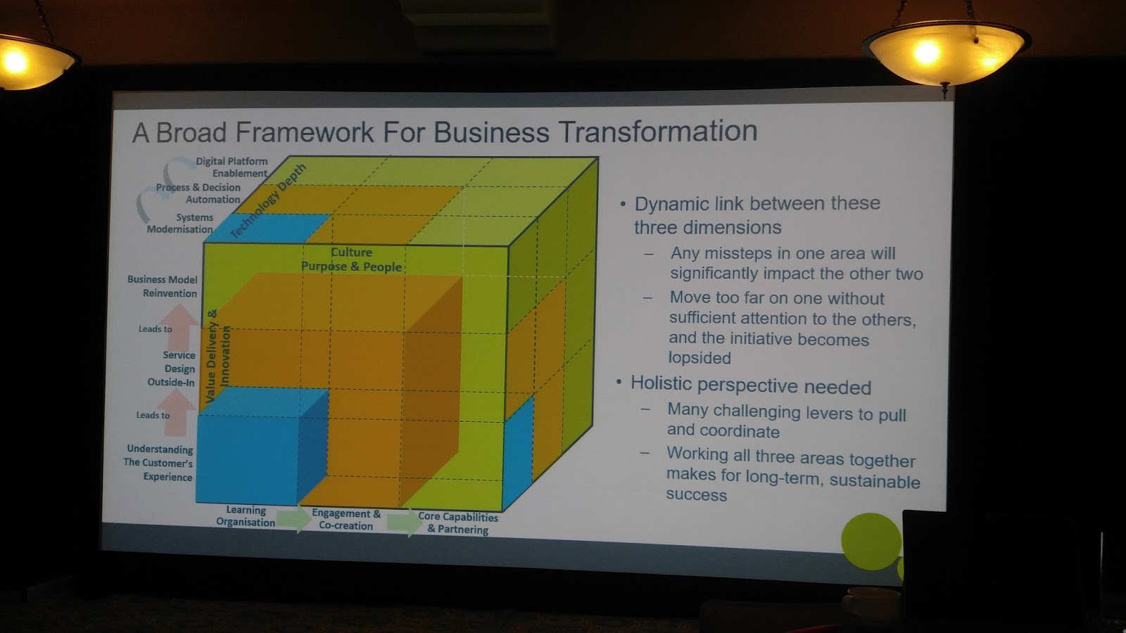 Derek Miers, recently joining MWD, gave us all a scolding on focussing on technology and not people engagement to build skills and competence necessary for digital transformation. Derek shared his framework for business transformation which he has been improving over the years.